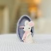 This little mouse fits perfectly in its little crib, complete with a tiny embroidered blanket.