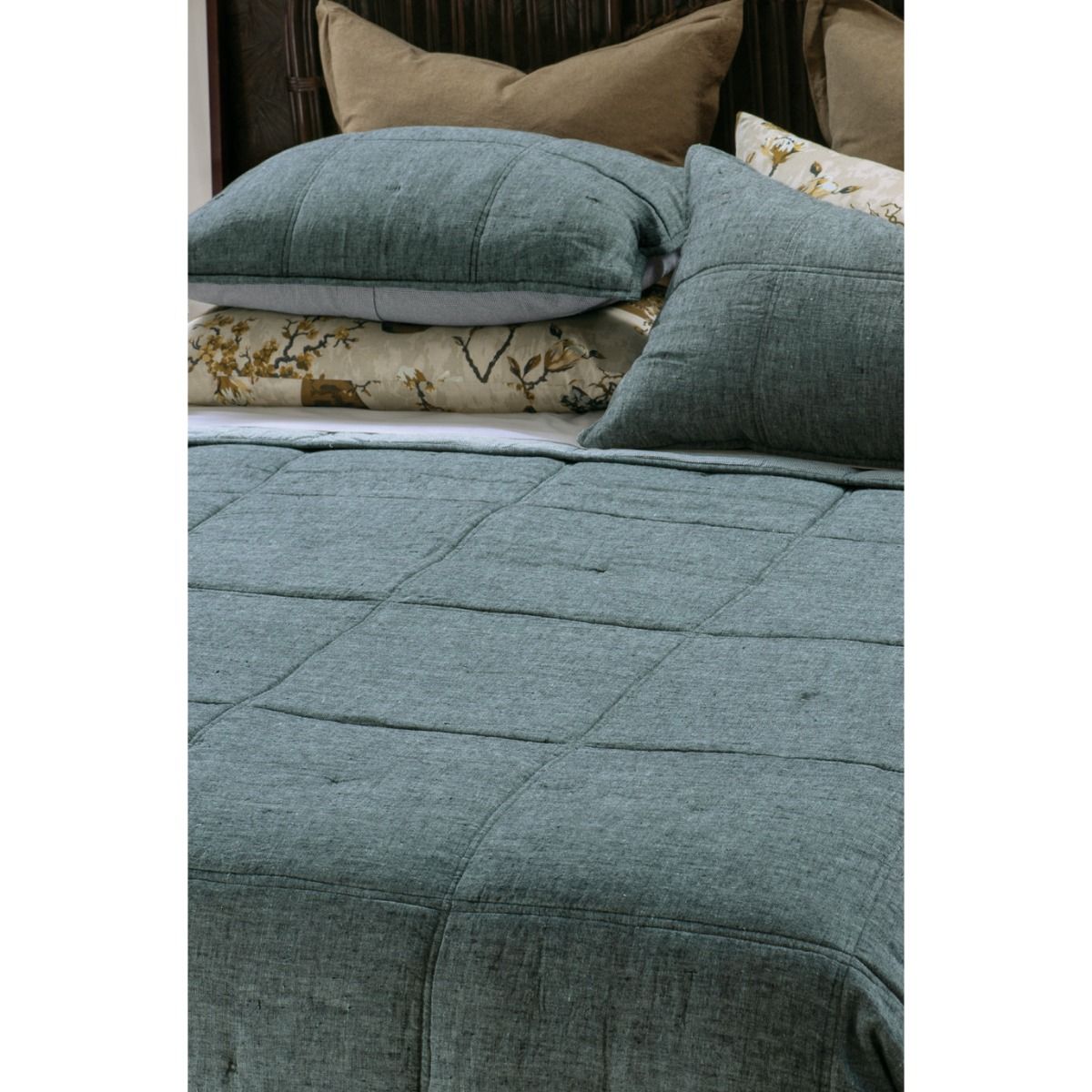 Through texture, colour and line, this bedspread of quilted squares celebrates sophisticated simplicity with an ocean linen chambray top and a co-ordinating houndstooth reverse. Noma ocean adds tranquility to your interiors.