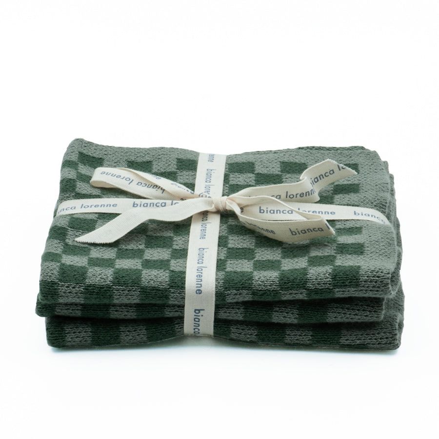 Our new Chekka washcloths feature one checked knitted design in a melange of sage tones and come in a set of 3.