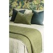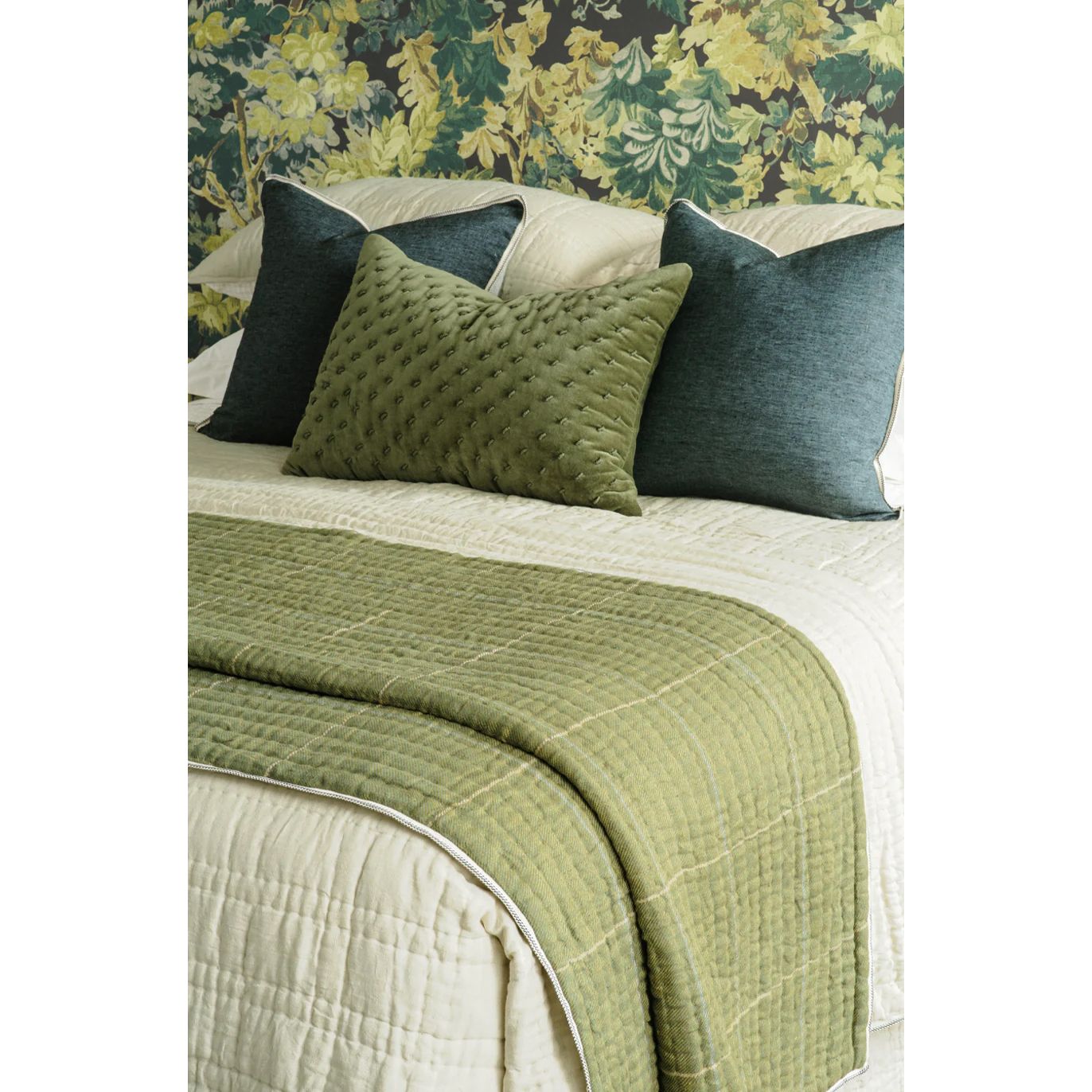 Appetto verde pays homage to the tight interlocking pattern of twill used in weaving tweed, one of the few fabrics that have maintained relevance in its original form for centuries. Lines of hand quilting extend across a twill weave dobby check linen fabric, balanced by a natural coloured dobby check fabric on the reverse. Finished with a contrasting ivory and black woven ribbon trim, this coverlet weaves together textures and tones to create a sense of tactility.