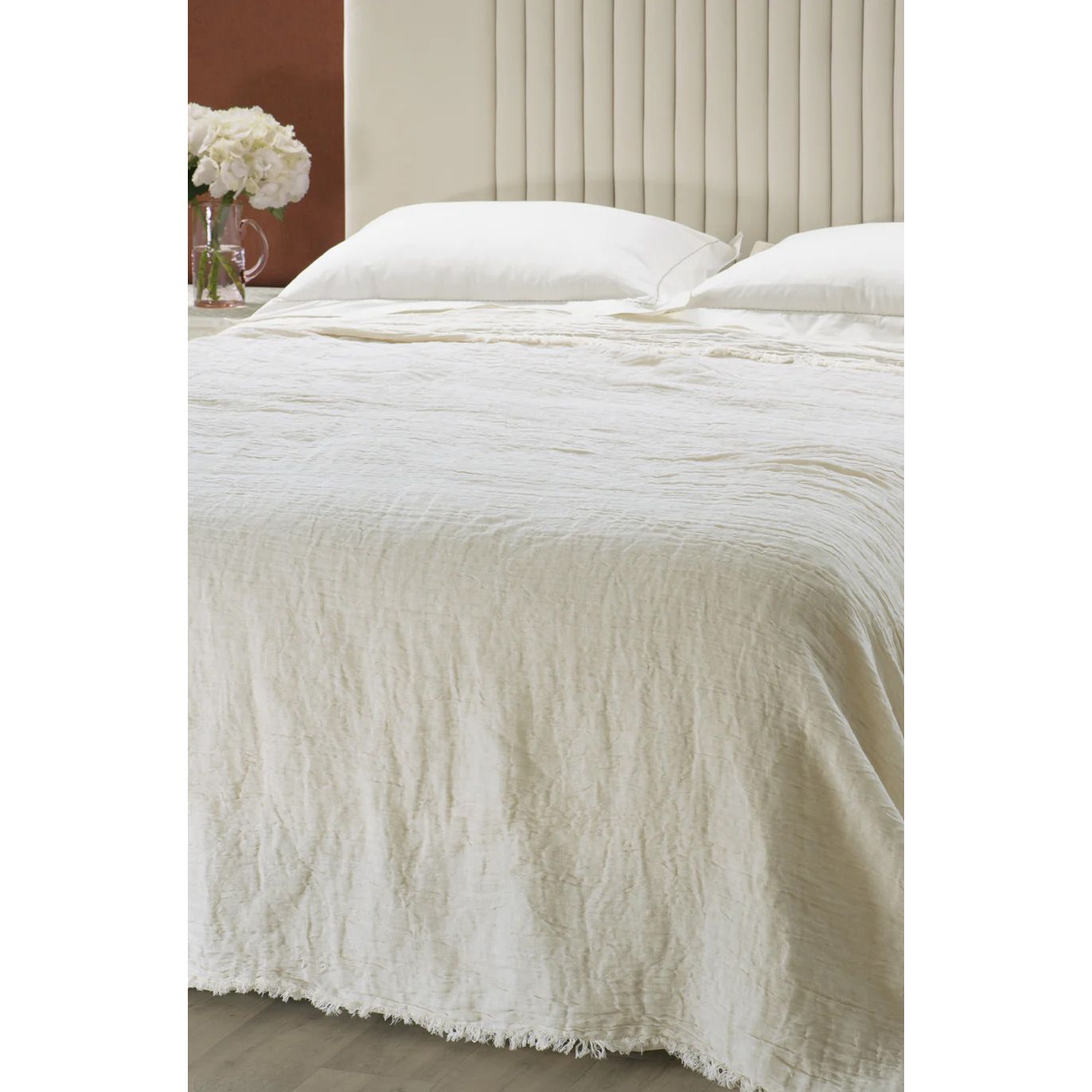 The ultimate lightweight blanket for balmy summer nights, Leggera is a double-layered, floaty gauze fabric made from a mix of linen and cotton. The crinkled, soft-washed finish with frayed edges brings a casual, relaxed aesthetic to any room. Alternatively if ironed smooth can provide a more tailored look. This generous blanket is reversible with an oatmeal top and an ivory underside.