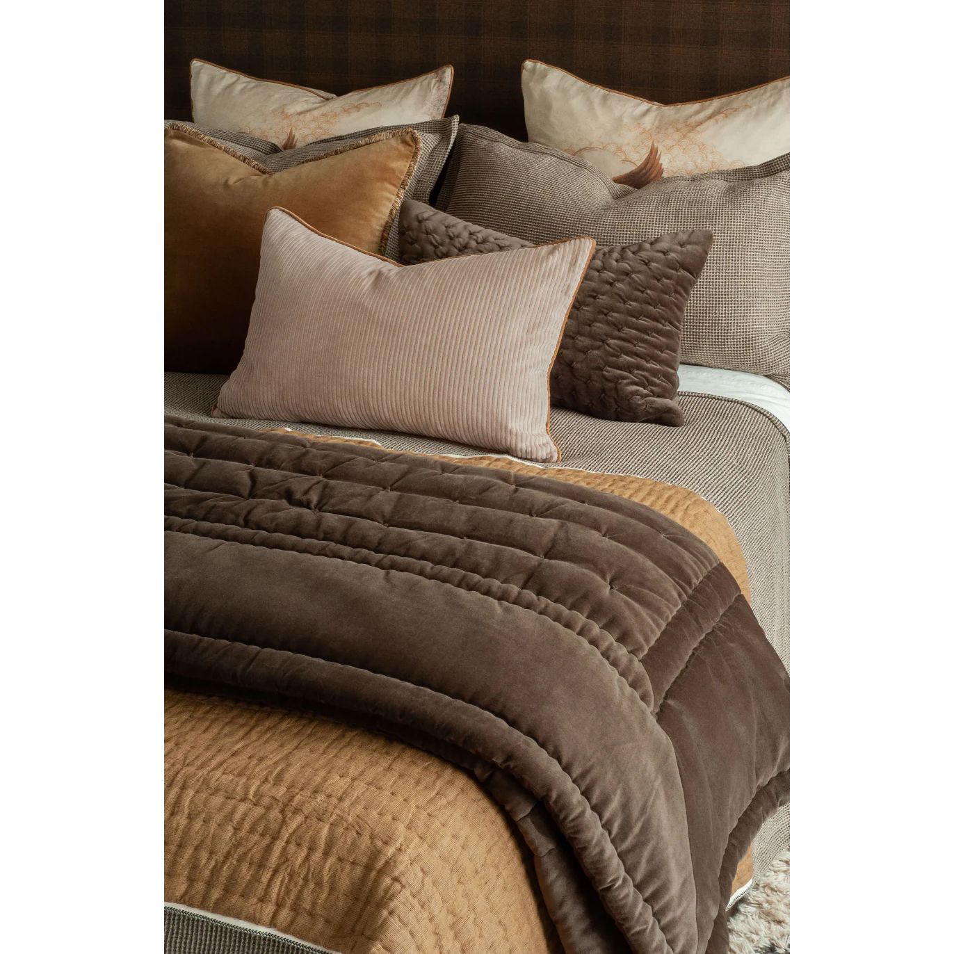 Mica cocoa enchants the senses, both in colour and style. A slather of warm cocoa cotton velvet melts across the end of the bed, with deep buttoned French knots like indulgent textural pieces sprinkled atop this comforter's surface.