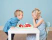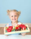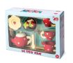 A 12 piece strawberry tea-set complete with cups and saucers, tea-pot and tea-bag, milk jug, water-based painted. Fabric cake and sturdy portable tea tray.