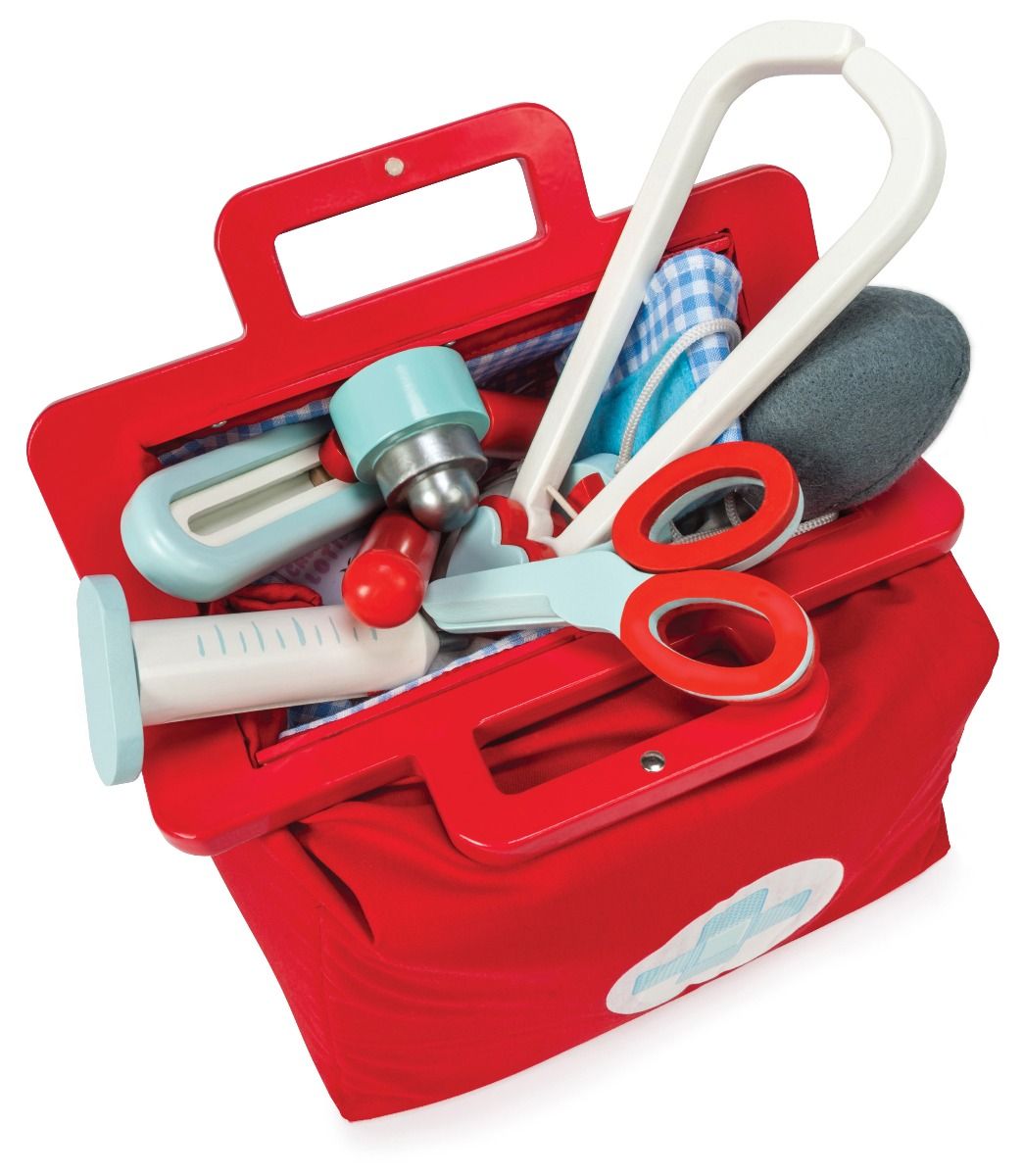 Doctor Doctor! A vintage style, child sized fabric Doctor’s Bag filled with wooden medical instruments and bottles.