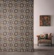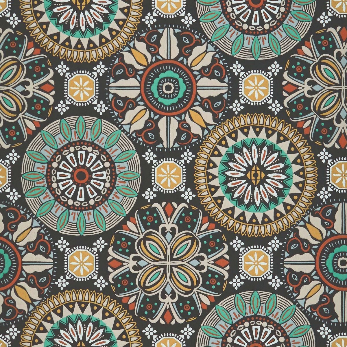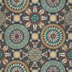 A composition of stylised roundels with a Byzantine touch, in colour combinations of charcoal and mint, grey and white or grey and blue.