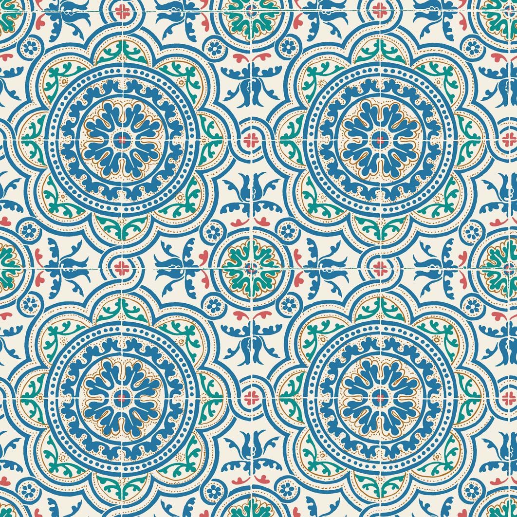 Composed of a host of beautiful curved, swirling lines, Piccadilly is a classic tile print found throughout Seville, from the Alcazar’s tiled bench nooks, to restaurant walls and elaborate ceramic floors. Piccadilly’s traditional print is made contemporary in striking shades of Denim & Rouge on Chalk.
