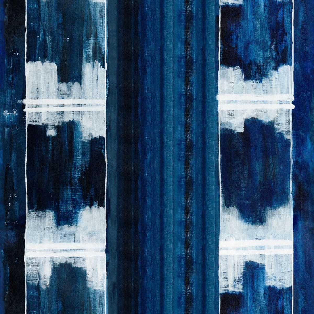 An intricate tribal design wallpaper in deep blue and white featuring a traditional cloth pattern called Yoruba Ashoke. Originally from Nigeria, this cloths are hand woven and are usually worn during major ceremonies. The design is printed over 3 panels each 52cm x 3.0m.