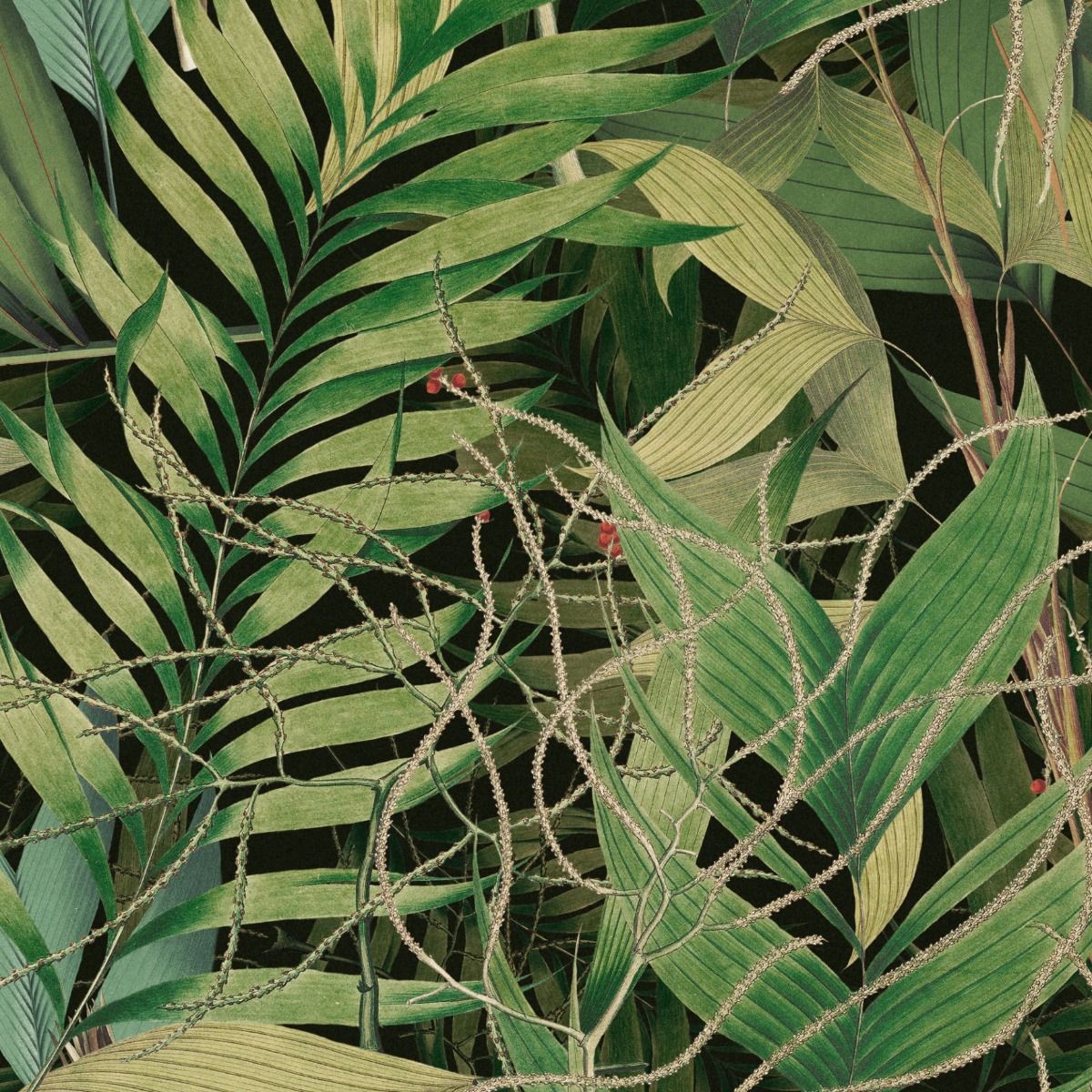 Exotic Garden is an extravagant green wallpaper with spectacular details of leaves and tropical vegetation. The amount of lush greenery against the dark background recreates the feeling of a deep tropical rainforest.