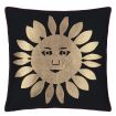 The sun is happy to be out and will be sure to out a smile on your face with this graphic cushion by Christian Lacroix. In resplendent gold foil the suns face is highlighted with embroidered stitching against the contrasting black ground. This contemporary interior cushion is completed with a colourful marbleised pattern on the reverse.