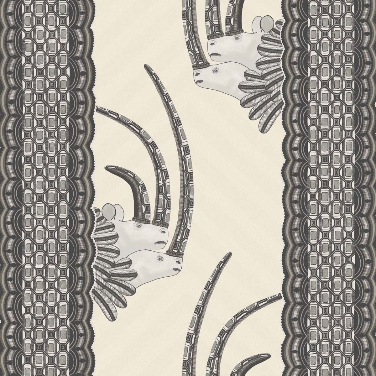 Named after one of Ardmore’s finest designers, Jabu Nene, this design takes its inspiration from the wonderfully sculptural rhino hand coiled vessels, created by sculptor Somandla Ntshanlintshali. These pots are then intricately painted in eye dazzling colours and patterns by Jabu Nene herself and now form a part of Ardmore’s most well loved signature styles. Our Cole and Son artists have used the markings on these pots to create a wonderfully rich and vibrant vertical stripe, out of which peek a pair of regal white rhinos complete with adorned horns and feathered ruffs.