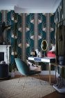 Named after one of Ardmore’s finest designers, Jabu Nene, this design takes its inspiration from the wonderfully sculptural rhino hand coiled vessels, created by sculptor Somandla Ntshanlintshali. These pots are then intricately painted in eye dazzling colours and patterns by Jabu Nene herself and now form a part of Ardmore’s most well loved signature styles. Our Cole and Son artists have used the markings on these pots to create a wonderfully rich and vibrant vertical stripe, out of which peek a pair of regal white rhinos complete with adorned horns and feathered ruffs.