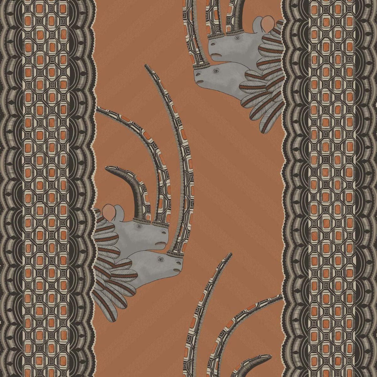 Named after one of Ardmore’s finest designers, Jabu Nene, this design takes its inspiration from the wonderfully sculptural rhino hand coiled vessels, created by sculptor Somandla Ntshanlintshali. These pots are then intricately painted in eye dazzling colours and patterns by Jabu Nene herself and now form a part of Ardmore’s most well loved signature styles. Our Cole and Son artists have used the markings on these pots to create a wonderfully rich and vibrant vertical stripe, out of which peek a pair of regal white rhinos complete with adorned horns and feathered ruffs.