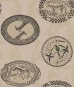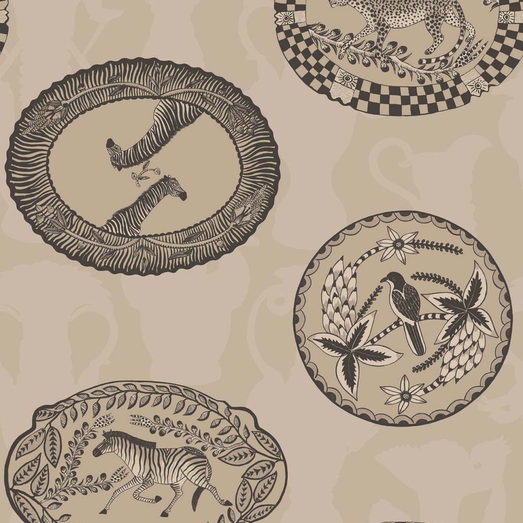One of the more classical designs within the collection, Matrinah, named after Ardmore designer Matrinah Xaba, reveals an arrangement of ornamental platters and dishes, all intricately patterned with birds and animals and edged with decorative borders and pie crust scallops. These in turn are placed on chalky grounds of olive, taupe, ivory, yellow ochre and pink featuring the softly silhouetted shapes of the vases from the Khulu Vases design. Presented in five striking colourways which include a subtle gilver on stone and soft gold on olive.