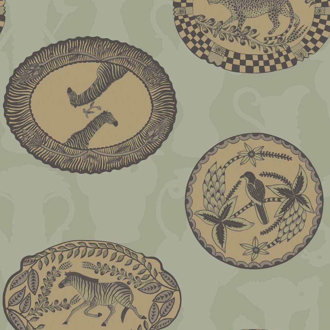 One of the more classical designs within the collection, Matrinah, named after Ardmore designer Matrinah Xaba, reveals an arrangement of ornamental platters and dishes, all intricately patterned with birds and animals and edged with decorative borders and pie crust scallops. These in turn are placed on chalky grounds of olive, taupe, ivory, yellow ochre and pink featuring the softly silhouetted shapes of the vases from the Khulu Vases design. Presented in five striking colourways which include a subtle gilver on stone and soft gold on olive.
