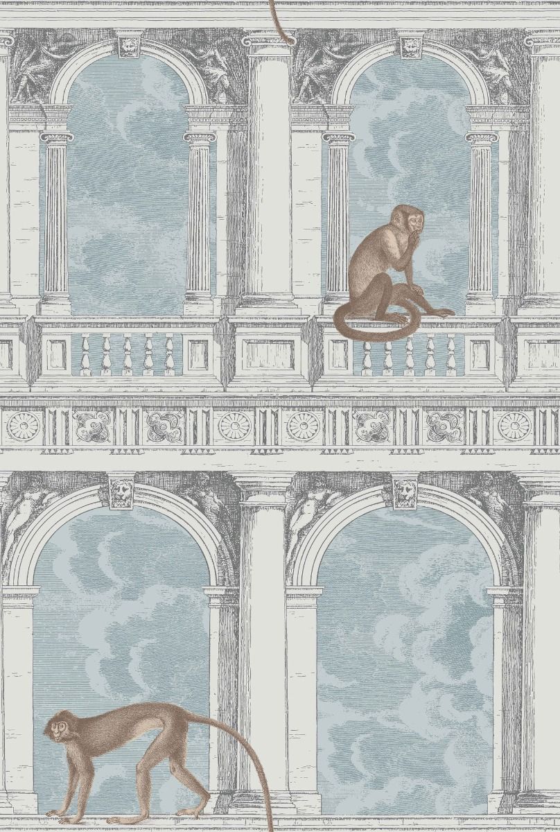The Procuratie facades of St Mark’s Square in Venice provide a primates’ playground for these mischievous monkeys, wrapped around the classical arches and ornate balustrades. Drawn in a simple intaglio style, the timeless soft palettes of Stone and Powder Blue, and Soot and Snow enhance the intricate line work without detracting from the design’s stunning scene.