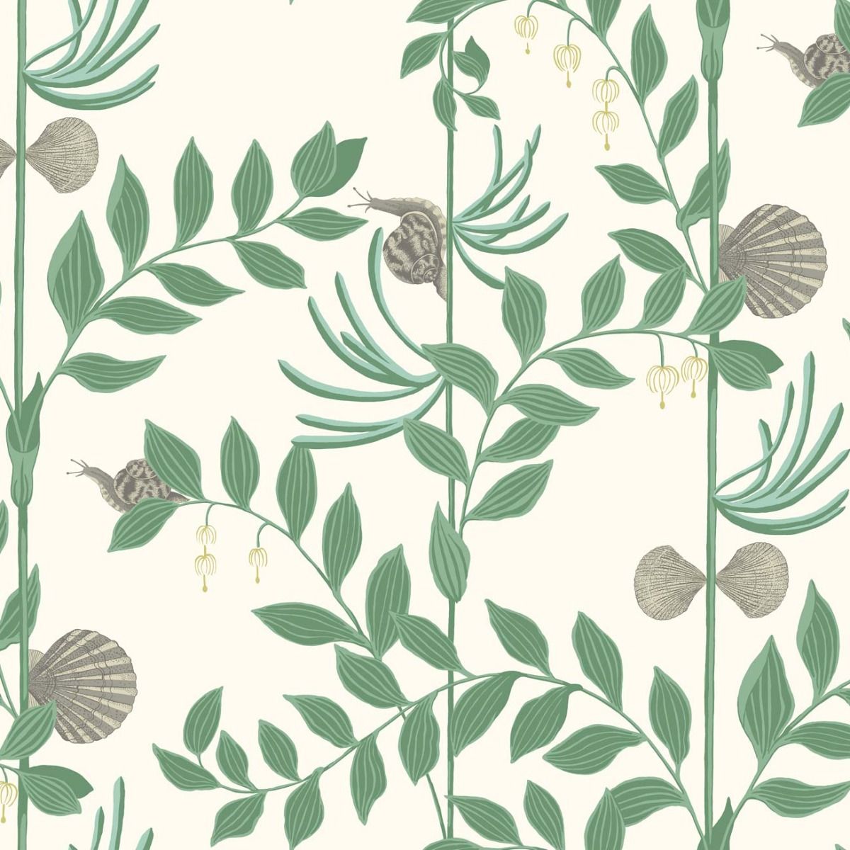 Designed as a companion to Nautilus, Secret Garden presents an amusing take on the traditional foliage pattern. Sea shells mingle with garden snails to reveal a verdant underwater jungle.