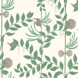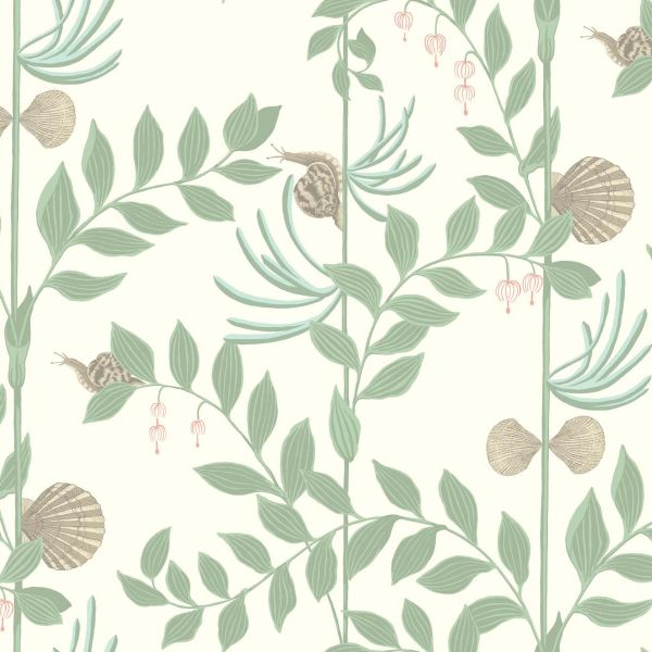 Designed as a companion to Nautilus, Secret Garden presents an amusing take on the traditional foliage pattern. Sea shells mingle with garden snails to reveal a verdant underwater jungle.