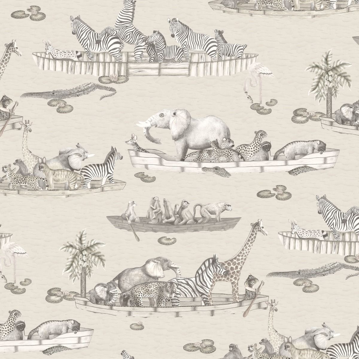 Zambezi features a flotilla of boats, originally sculpted by Sotho artist Benet Zondo, captained by an array of animals all floating gently down the Zambezi river in Zimbabwe. Inspired by Operation Noah, a mission led by people in boats to save drowning animals when the Zambezi flooded in the 1960s, this delightful wallpaper will be loved by children and adults alike. Softly coloured zebras monkeys, elephants and hyenas all feature as do the occasional crocodile and haughty flamingo.