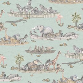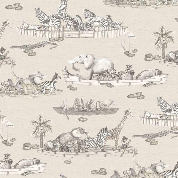Zambezi features a flotilla of boats, originally sculpted by Sotho artist Benet Zondo, captained by an array of animals all floating gently down the Zambezi river in Zimbabwe. Inspired by Operation Noah, a mission led by people in boats to save drowning animals when the Zambezi flooded in the 1960s, this delightful wallpaper will be loved by children and adults alike. Softly coloured zebras monkeys, elephants and hyenas all feature as do the occasional crocodile and haughty flamingo. The design is offered in two colourways of soft water coloured pastel tones and a calm yet sophisticated neutral and is printed with a striking 70cm wide repeat on a half drop.