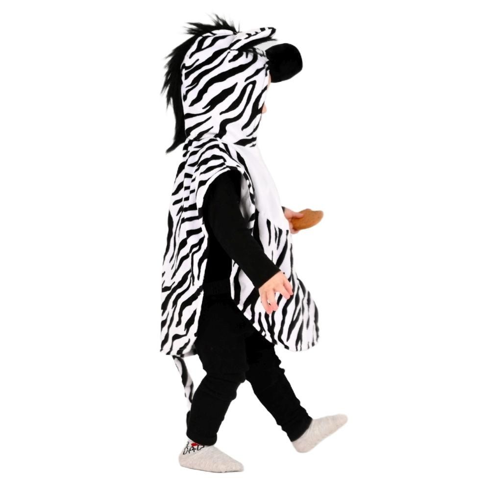 Adorable Zebra cape costume for the little ones. Just like our other mini capes, the Zebra Cape has a Velcro closure at the front and elastic bands on the sides for easy dressing and undressing. This also makes it easier to play and frolic in. The cape has ears on the hood, zebra nose and tail on the back. Faux fur is used as the mane. A favorite with little ones!