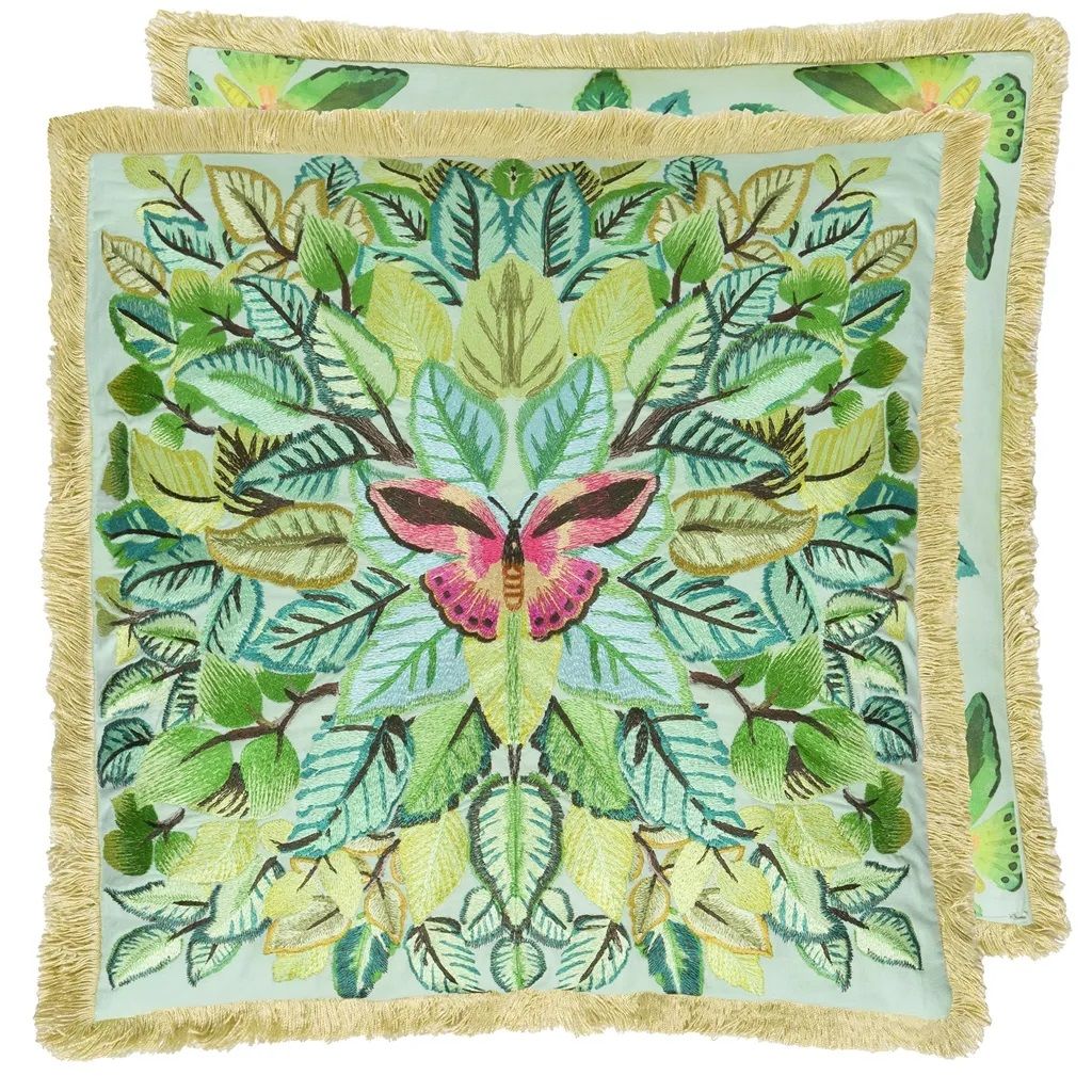 Exquisitely detailed leaves are fully embroidered in an artful kaleidoscopic mirrored form to create a contemporary floral cushion. A resplendent butterfly sits proudly in the centre. In soft turquoise tones, this decorative embroidered cushion is completed with a leaf and butterfly print digitally printed onto cotton on the reverse. Finished on all sides with a luxurious fringed trimming.