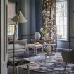 A dramatic all-over digital print of expressive dahlias in wonderfully subdued tones, on a slate hued ground. This softly tumbled, pure linen floral fabric makes for stunning curtains, cushions and blinds.