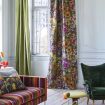 A contemporary evocation of exquisite large scale zinnias and sunflowers. Beautifully coloured and intense in warm saffron, rose and amethyst tones, the florals float above a shaded and printed graphite ground. Available in one dramatic colourway. Digitally printed on a linen union for wonderfully evocative floral curtains, blinds and cushions.