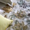In dramatic mirrored damask form, this stunning embroidery features large scale floral motifs, elegantly intertwined with leaves and foliage with a variety of stitch techniques creating intricate detail and dimension.