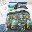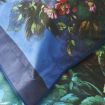 Expansive painterly blooms and trailing leaves are artfully arranged with a kaleidoscopic geometric overlaid background in this stunning bed linen design in vivid tones of cobalt emerald and azure. Fully reversible to the geometric pattern and finished with an indigo blue contrast edge detail.