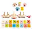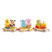 The Djeco Activity train is a wooden pull-along toy that includes 24 interchangeable wooden blocks designed to resemble a tractor and various animal passengers. The blocks can be rearranged in different combinations before the toy is pulled along.