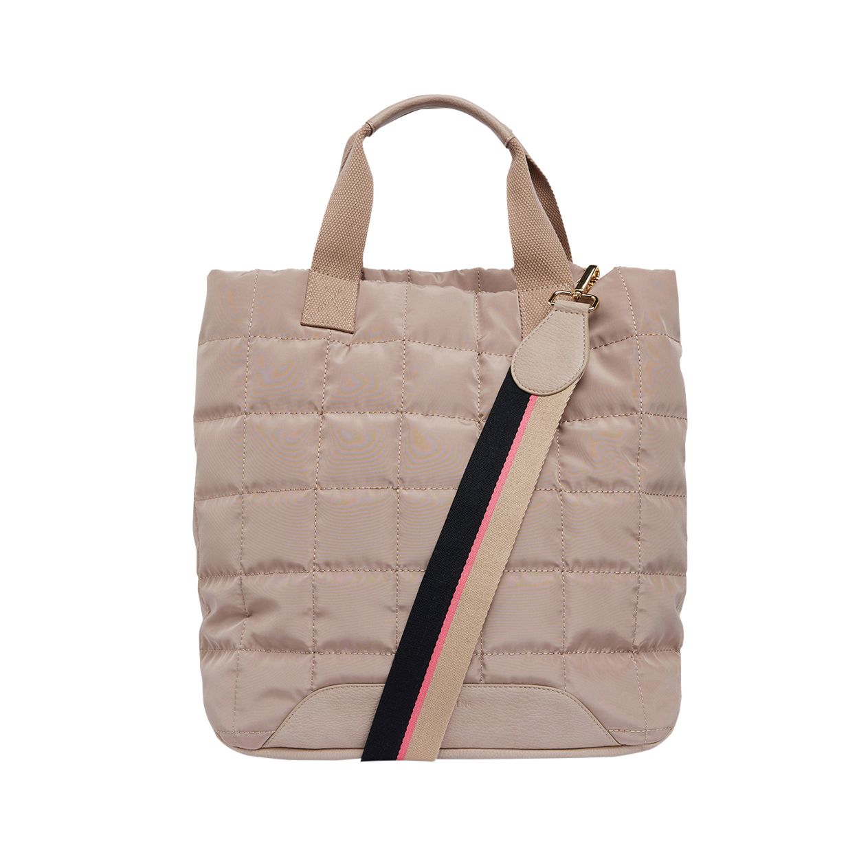 The Elms and King Santa Monica Tote is bucket-style tote. The tote features a centre buckle closure, and interior detailing to hold all your essentials. With handy top grip handle, plus a removable crossbody strap, whether your day starts at the gym, or out & about, the Santa Monica has you covered. Made from premium quilted nylon, the Santa Monica Tote features a bright pop nylon lining.