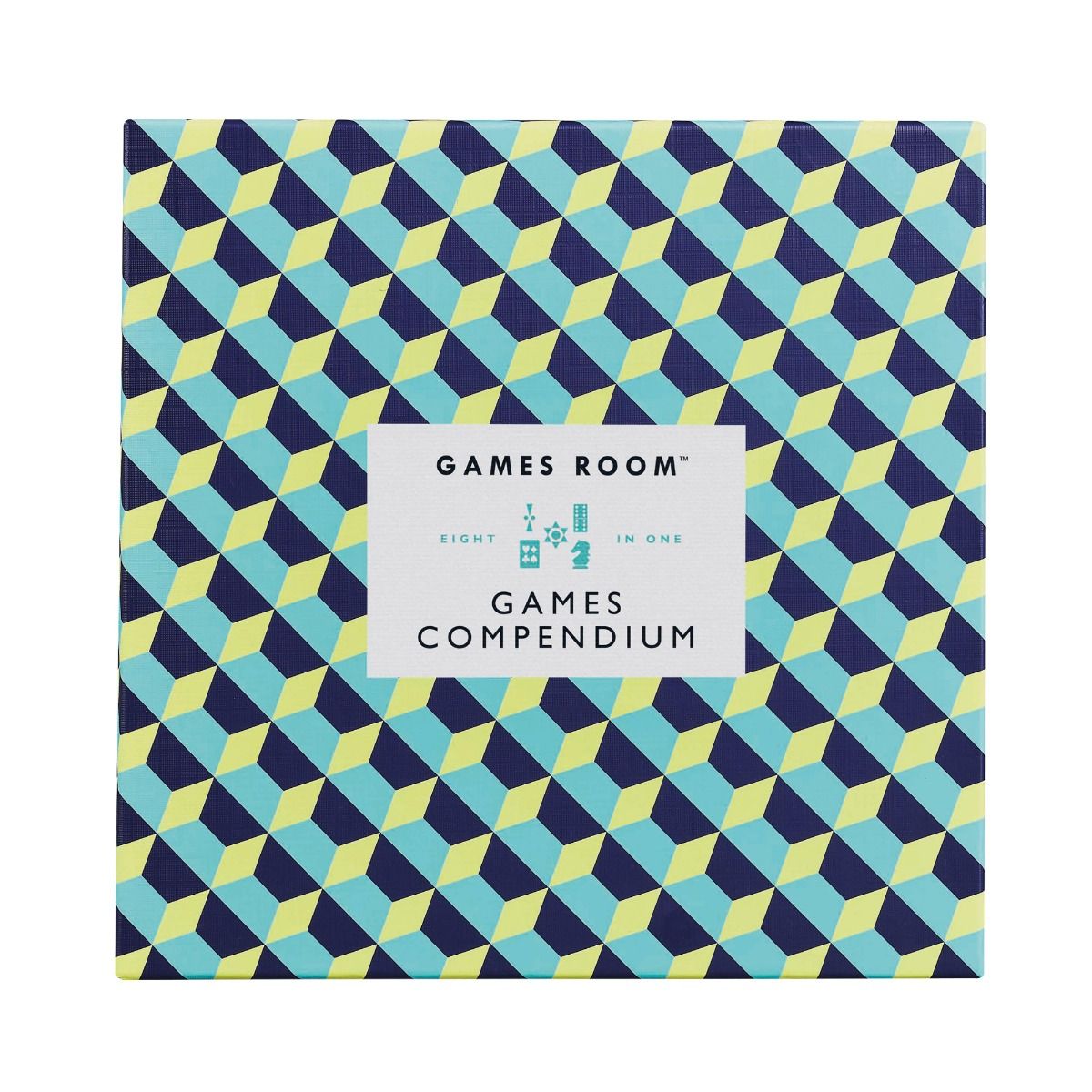 Includes Backgammon, Chess, Chinese Checkers, Dominoes, Checkers, Ludo, Pick-up Sticks, and Playing Cards. Packaged in a geometric box with full instructions. Size: 270 x 270 x 37mm