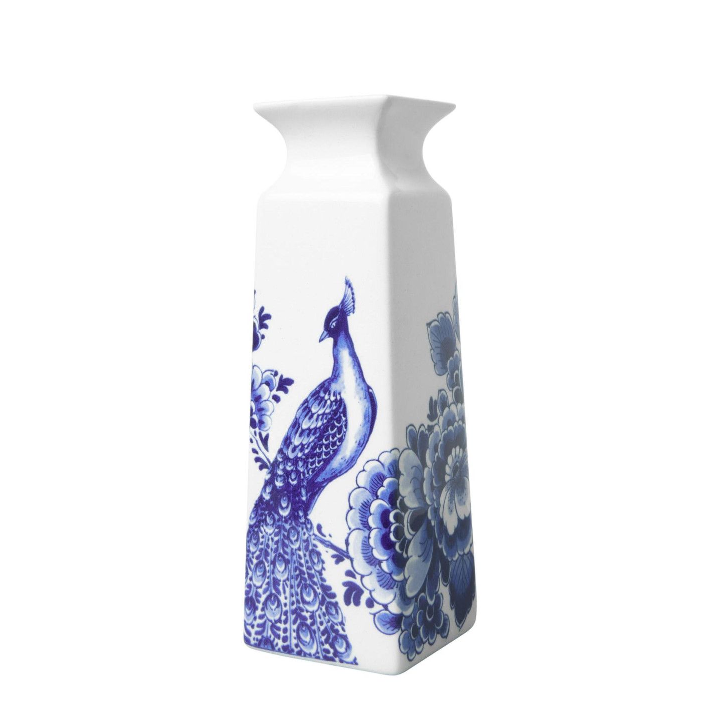 This striking square ceramic vase combines a modern silhouette with classic Delft blue styling. Its unusual rectangular form gives it a contemporary edge, while the elegant peacock and floral motif add a refined, timeless charm.