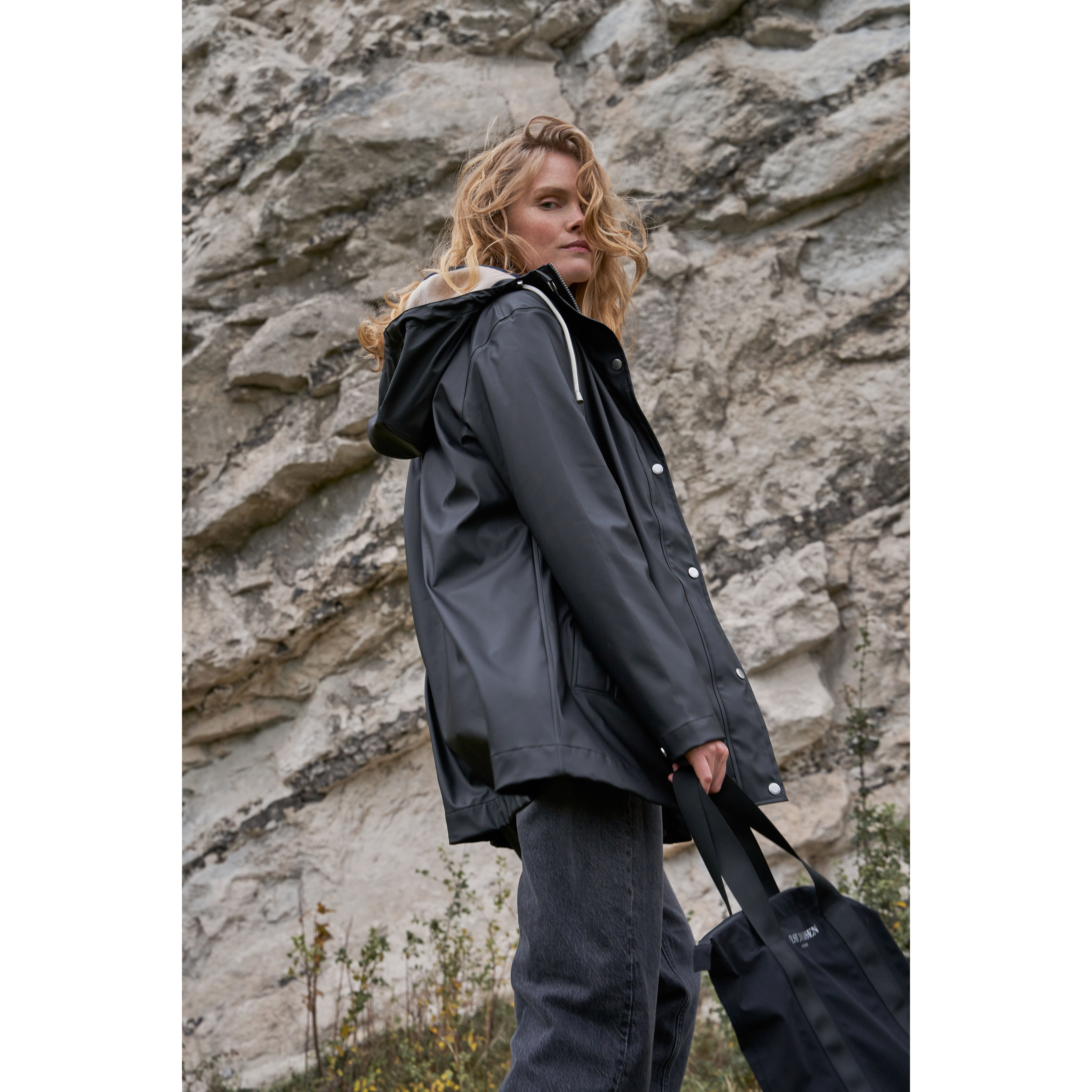This new contemporary wardrobe staple is a straight-fit raincoat in durable lightweight-wearing rubberized PU coated waterproof fabric.