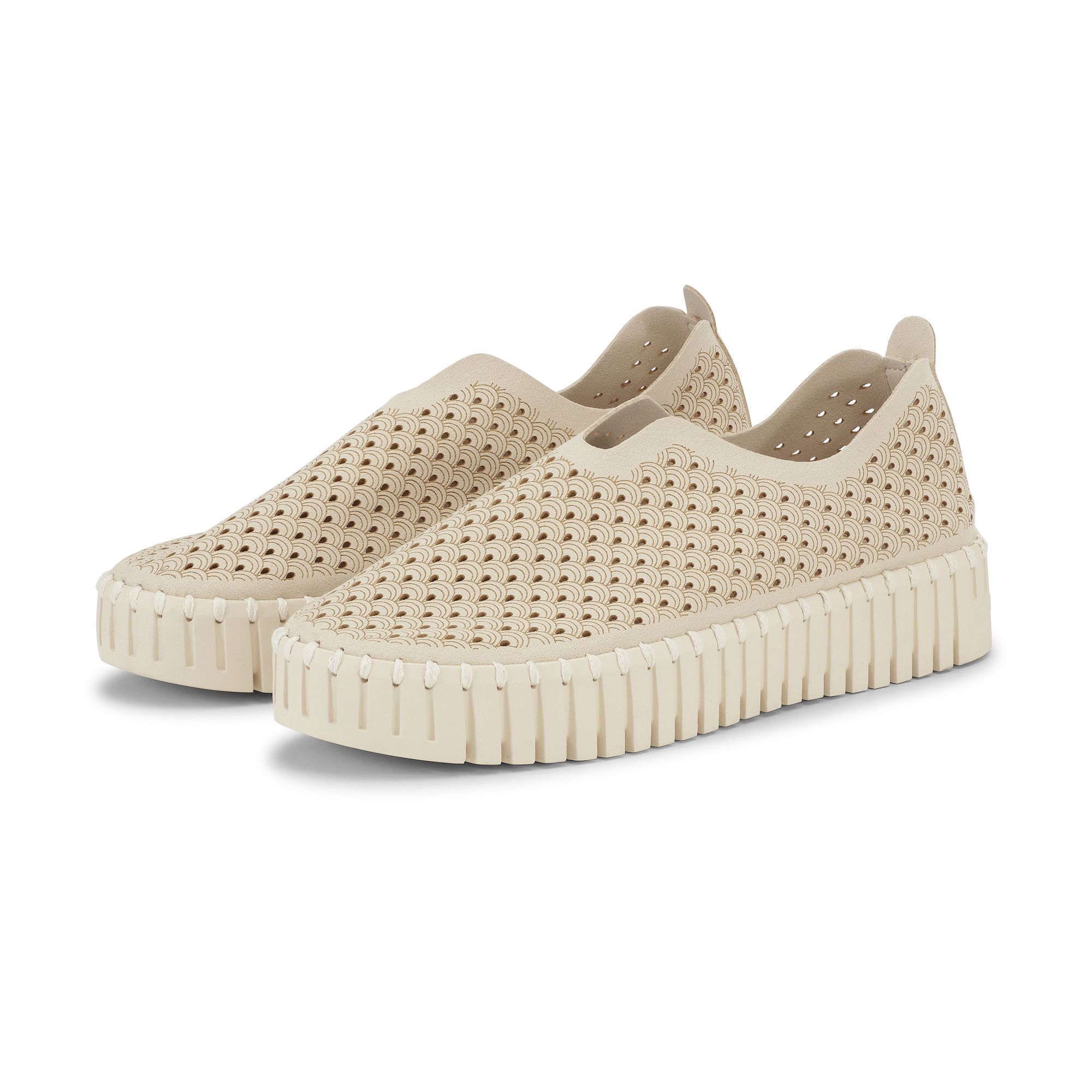 Crafted from recycled microfiber with a beautiful laser-cut pattern, they rest on a modern platform version of the flexible Tulip outsole — offering added lift without compromising lightness or ease. Stitched with colour-matched recycled thread using no glue, these flats reflect a conscious approach to everyday wear. Inside, a softly padded insole provides long-lasting comfort and gentle support with every step.