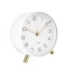 A simple and classic alarm clock with gold hands & stands. Features an LED light that can be turned on and off when needed. Works silently without ticking.