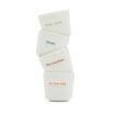 White porcelain egg cups in a set of 4. The words are hand stamped and painted in retro typewriter font, with 'what came' in green, 'first' in blue, 'the chicken' in red and 'or the egg' in orange. Designed by Keith Brymer Jones.