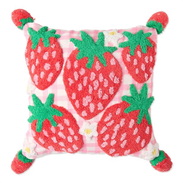 Strawberry Jam Tufted Pom Pom Cushion features a pink and white gingham pattern made from 100% upholstery linen with tufted cotton embroidered strawberries and little white flowers and strawberry pom pom corner details.