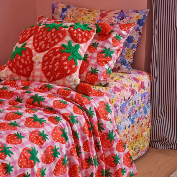 Add a burst of sweetness to your space with the Strawberry Jam Organic Cotton Quilt Cover, featuring a sea of plump red strawberries, ripe and juicy, with a pink and white painted gingham pattern base.