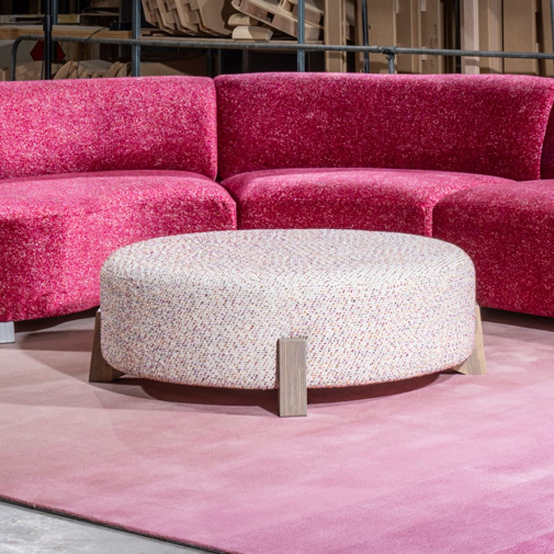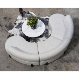 A modern round ottoman from Kovacs designed to sit perfectly with the Elton sofa.