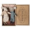 A classic Maileg mouse item. Grandma and grandpa are wearing their nightwear and beautiful shoes. The cigar box is a perfect bed for a good night's sleep. Extend their wardrobe with sets of loose clothes to create a perfect playset.
