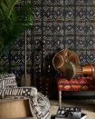 A traditional African style mud cloth pattern with beautiful large scale authentic design made in black and white. A very simple yet bold wallpaper pattern with handmade geometrical lines on a mud-black background. The design is printed over 3 panels each 52cm x 3.0m.