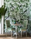 A statement aviary wallpaper with large scale parrots and foliage illustration recreating the look of a royal large bird cage. A wallpaper designed on 3 rolls for maximising the pattern repetition. Available in 3 colour options - Green, Indigo and Dark.