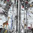 A fantastical array of colourful birds and exotic animals set against the background of tall trees and cloudy skies depicted in monochrome.