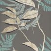 A trail of metallic leaves printed to resemble gold, copper or gilver foil is set on a subtle background of silhouetted ferns. The softly coloured backgrounds are blush, aqua, sage, stone, dove grey or cacao.