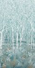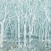 A whimsical woodland scene with a carpet of ferns, bluebells, wild tulips and toadstools is presented as a woodcut mural design with ombre colour throughout the trees, foliage and background.