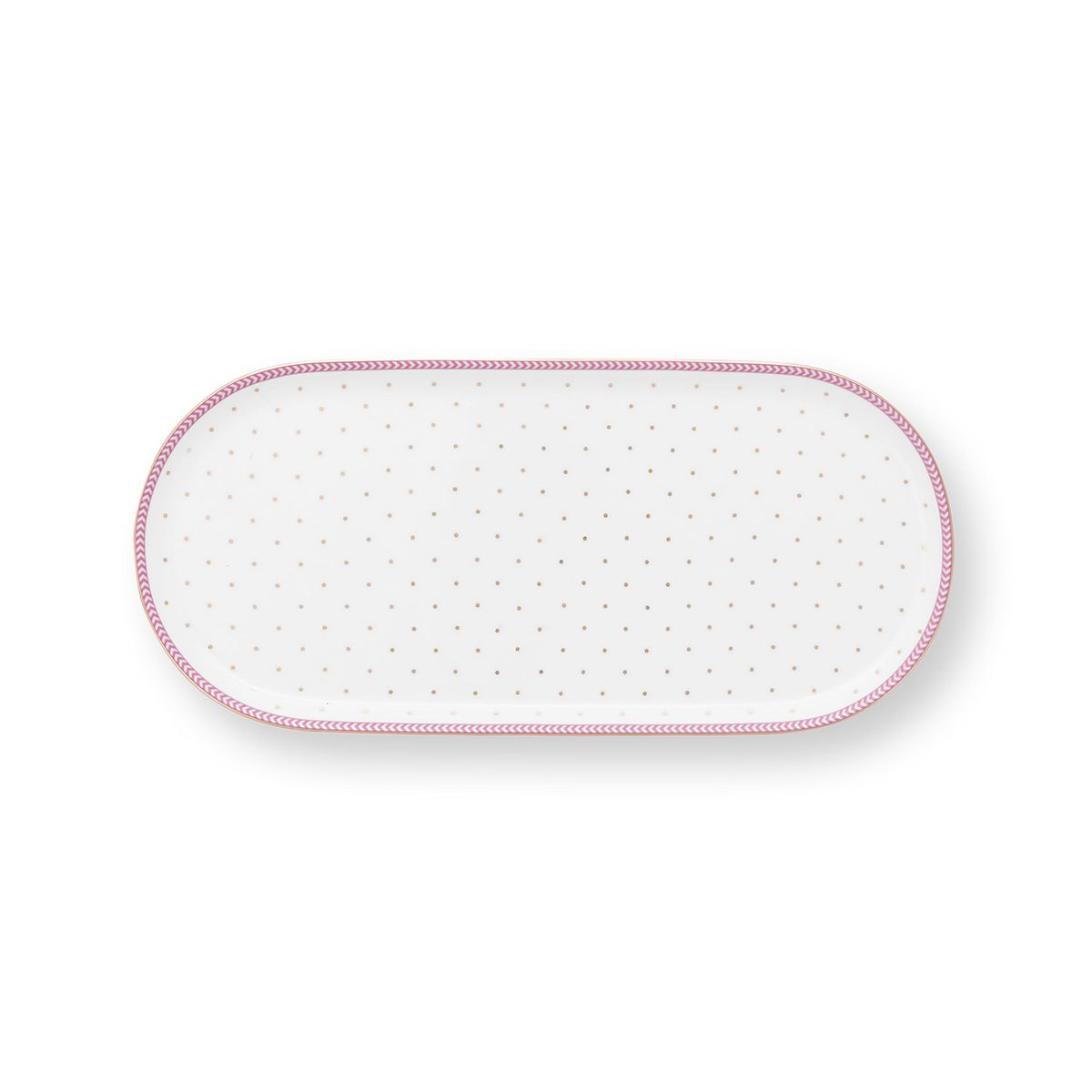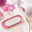 This cheerful rectangular plate the perfect addition for to serve your favourite sweet treats . Subtly adorned with fine golden dots and a pink rim.