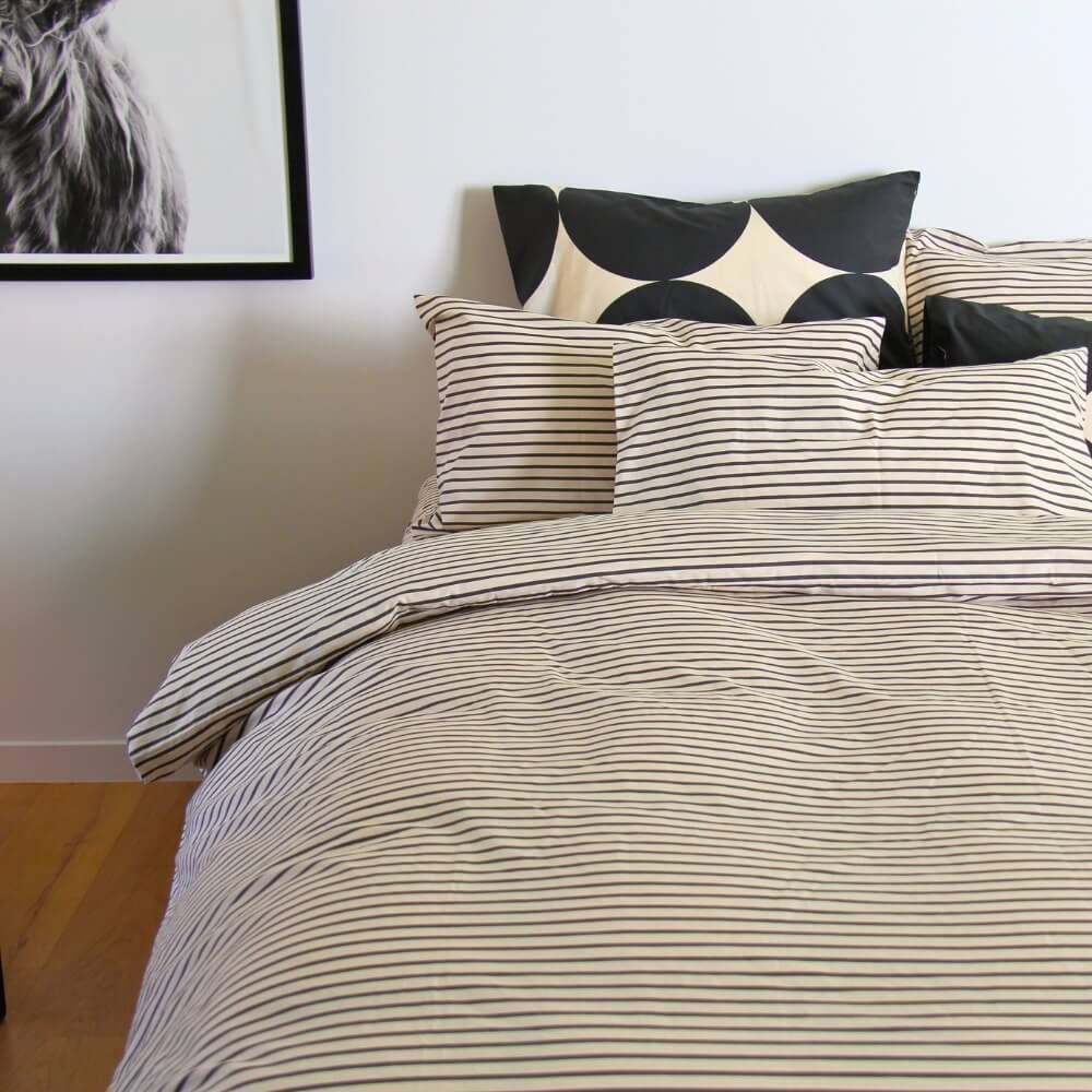 Step into a space where design is intentional; subtle yet striking! The Luna black & oatmeal striped duvet cover is an invitation to experience subtle elegance. A duvet defined by a pattern of narrow stripes in warm black and beige.