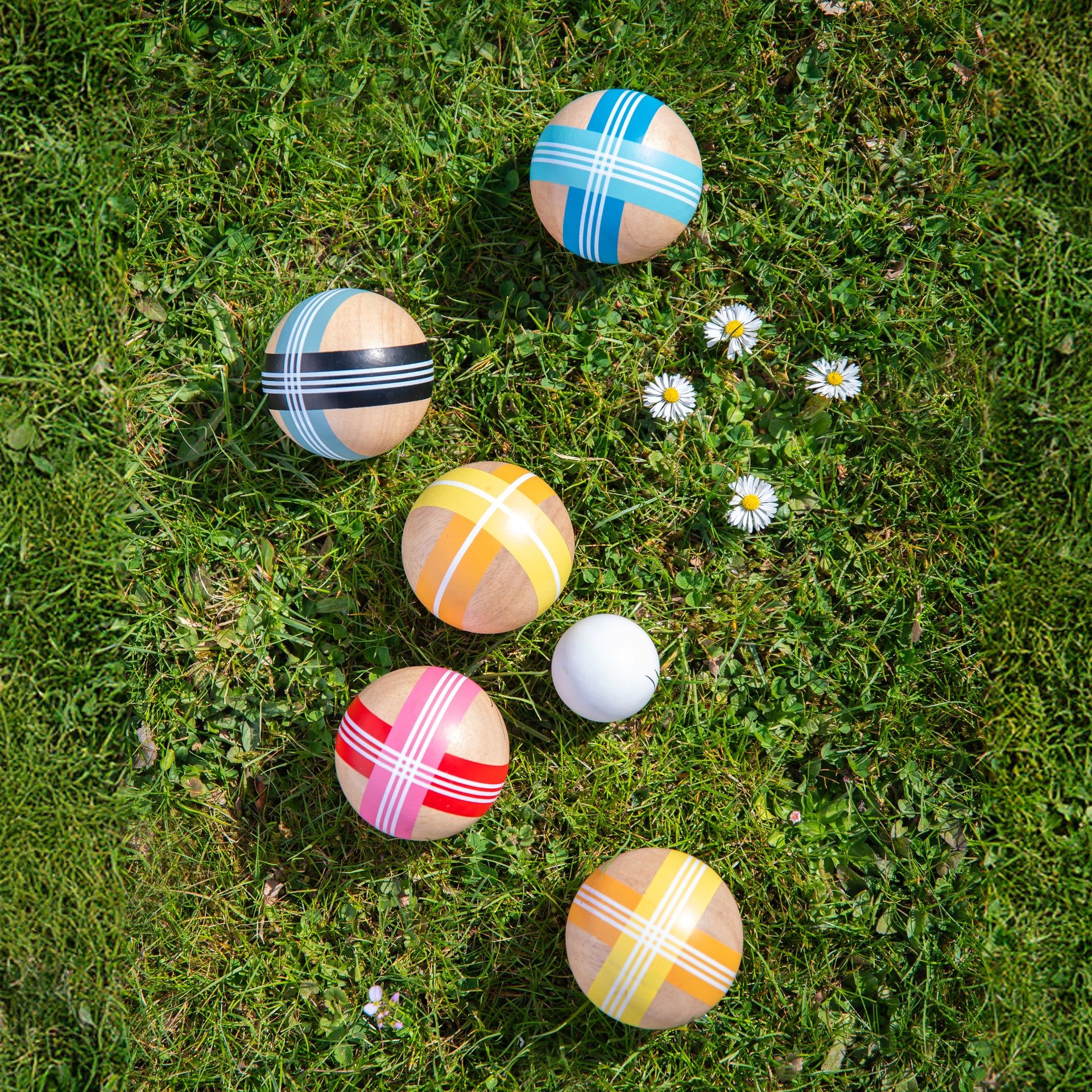 Who can use their skill or the right strategy to get their large boccia ball as close as possible to the small one? Whether in pairs or in larger teams - this classic outdoor game is always fun and promotes concentration and motor skills. The set consists of 8 large balls made of solid wood with a beautiful striped pattern and a small wooden ball.