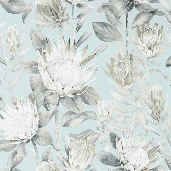 Inspired by an original Sanderson archive document, the majestic flowerheads of the King Protea plant have been faithfully interpreted and recoloured to create this stunning statement wallpaper. The designs sophisticated Linen colourway gives a hint of glamour against the matt tone work, which together with the Aqua colourway has lovely mica highlights.